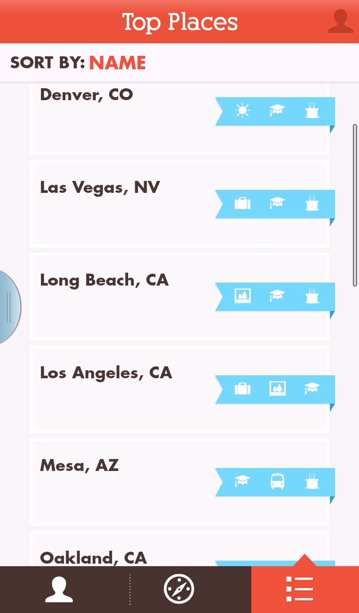 Each city is accompanied by a series of three icons, which at a first glance seem to represent the three areas in which the city fits in with what you considered to be an important factor in your relocation decision. A further look shows that this is, in fact, somewhat odd and contradictory. Back when I filled out my profile (see the image above), I had essentially said that the education level of my friends was low priority. Given this stipulation, it makes sense that pretty much every listing has a little graduation cap next to it, saying that it fits my education preferences.