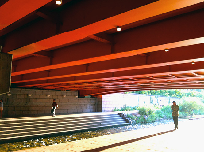Cheonggyecheon is also comfortable in the urban planning sense because it satisfies two important human needs: prospect and refuge. The stream has several different levels that allow individuals to survey from the elevated bridges or seek solitude and quiet conversation in the sheltered confines of the walking path. The bridges also provide shaded areas of vegetation in the hot summer months, as well as nooks in the embankments populated by art exhibits. On a basic level, it follows Jan Gehl’s exhortation to keep urban places small. The narrow width of the project encourages the density of activity that makes the major traffic artery feel used and alive.